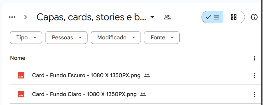 Caso queira visualizar os arquivos de modo que apareça o nome que tem o tamanho do arquivo em pixels, basta clicar nas três linhas no canto superior direito da tela que será possível visualizar como lista.